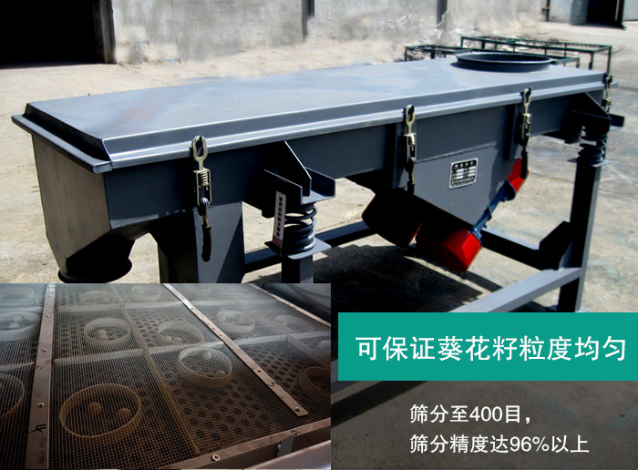 直線振動(dòng)篩可以篩分至400目,篩分精度達(dá)96%以上,篩選精度高,可以保證葵花籽除雜效果更好,粒度更加均勻。