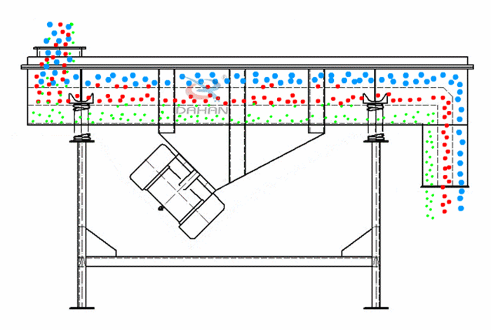 當(dāng)葵花籽經(jīng)由直線振動(dòng)篩入料口進(jìn)入直線振動(dòng)篩篩面上時(shí),直線振動(dòng)篩利用其雙臺(tái)電機(jī)的激振力及葵花籽自身的重力作用,使得葵花籽在篩面上被拋起并向前運(yùn)動(dòng),小于篩面孔徑的葵花籽落入篩面下層,大于篩面孔徑的葵花籽在跳動(dòng),不同規(guī)格的葵花籽分別從各自的出口排出,以此完成整個(gè)篩分除雜過程。