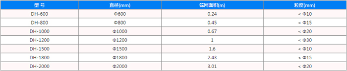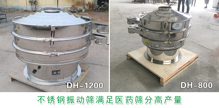 不銹鋼振動(dòng)篩型號(hào)有DH-400、DH-600、DH-800、DH-1000、DH-1200、DH-1500、DH-1800、DH-2000等標(biāo)準(zhǔn)直徑型號(hào),平均單次篩分醫(yī)藥物料產(chǎn)量可達(dá)1-5t,滿足醫(yī)藥篩分高產(chǎn)量的需求。還可根據(jù)需求特殊定制。